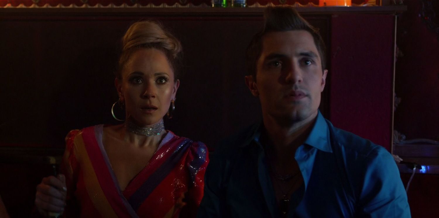 Juno Temple as Keeley Jones, and Phil Dunster as Jamie Tart at the club in Season 1, Episode 3, "Trent Crimm: The Independent."