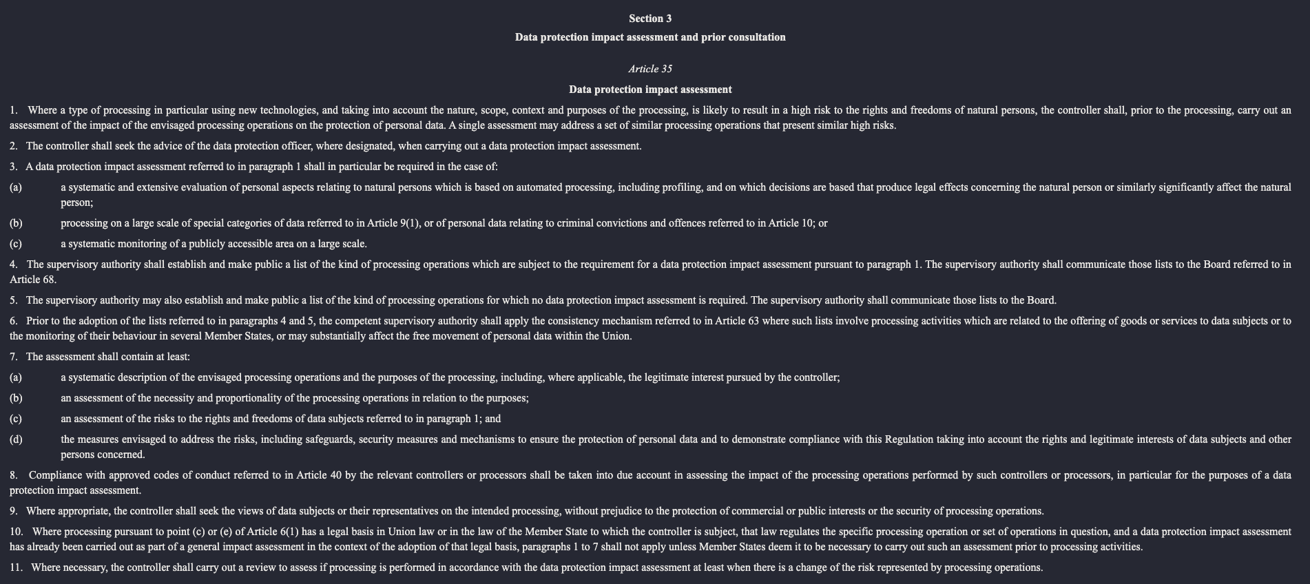 In GDPR, Chapter 4, Section 3, Article 35. defines DPIA as below: