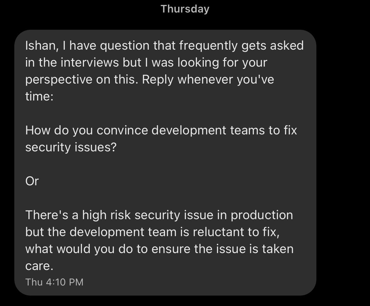 Our job is to surface security issues and help the business make the right decisions. Our job is not to get every security bug fixed. Our job is to help the team prioritize the right issues to fix in the right way. Our job is not to force them to do something by a specific date.