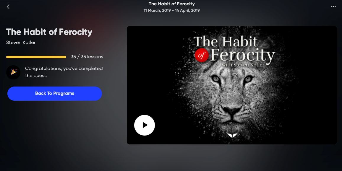 The “Habit of Ferocity” course by Steven Kotler on the Mindvalley platform is 5 hours long and consists of 35 Lessons. Over 143885 people have enrolled as of October 16, 2021.
